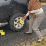 2. Remove flat tyre and replace with your spare tyre. Tighten the wheel nuts with the Rattle Gun. Press the switch on the Ezijak to lower your vehicle.
