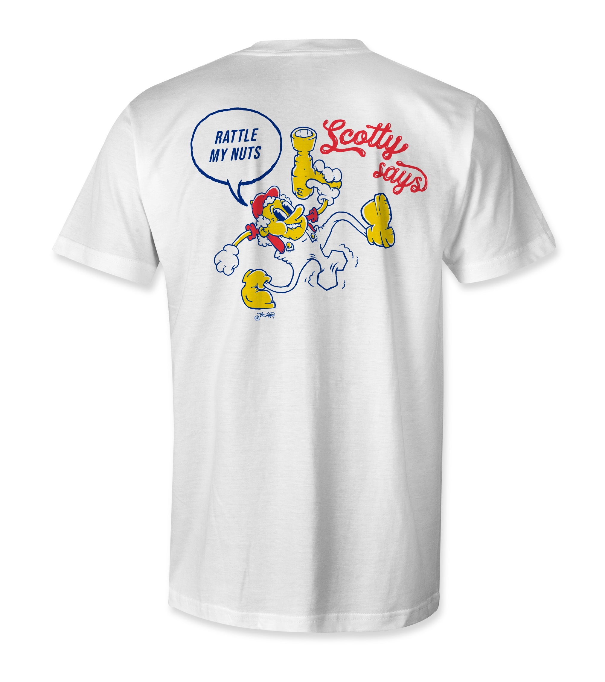 The Scotty Says Rattle My Nuts T-Shirt is a relaxed-fit, heavy-weight tee designed for casual wear.